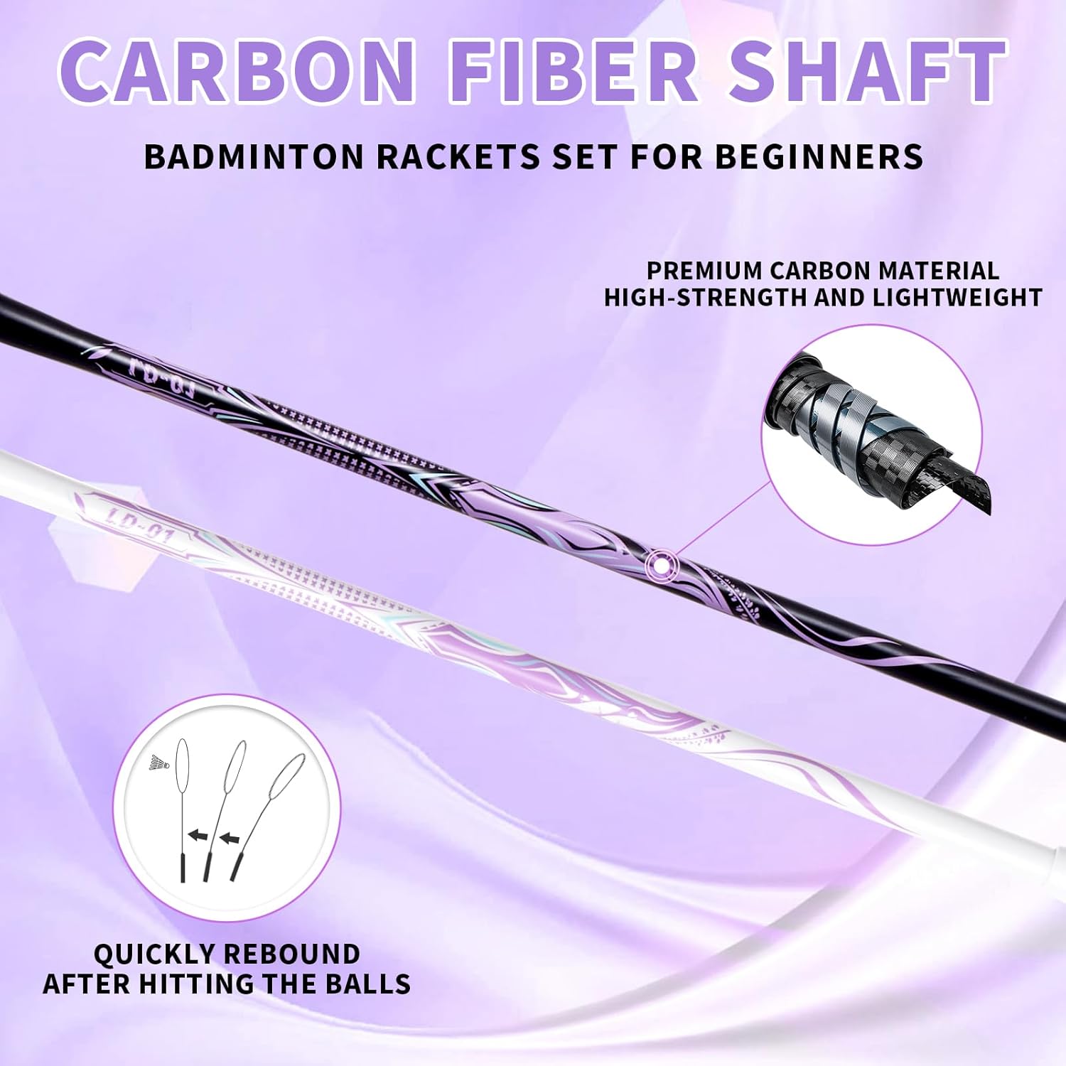 Introducing the KUMPOO Badminton Racket Set - the ultimate choice for professional badminton players. This high-quality set includes one professional-grade badminton rackets and two grip tap, allowing you to take your game to the next level. Designed for optimal performance, these rackets are made with lightweight and durable carbon fiber material. This ensures excellent maneuverability and durability, allowing you to dominate the court and enjoy seamless gameplay. The carbon fiber construction also enhances the strength and stability of the rackets, minimizing the risk of deformation during intense gameplay. With a professional design, these rackets feature a balanced grip and a lightweight construction. This allows for improved control and precision, enabling you to make powerful shots with ease. The isometric square head shape frame structure expands the sweet spot, ensuring a higher chance of hitting the shuttlecock accurately. These rackets are also equipped with a specialized T-joint design, providing enhanced stability and high-precision control performance. The built-in T-joint prevents any deformation caused by intense playing, ensuring that the rackets maintain their top-notch performance for a long time. Each racket in this set comes with a non-slip handle grip, offering maximum comfort and preventing any slippage during intense gameplay. The perfect design details, such as the cone cover for improved fluid dynamics, further enhance your overall playing experience. In addition to the exceptional quality of the rackets, we also offer reliable customer service. Feel free to contact us at any time if you have any questions or concerns after your purchase. We are committed to providing the utmost satisfaction to our customers. Upgrade your badminton game with the KUMPOO Badminton Racket Set. Order now and experience the professional performance and q