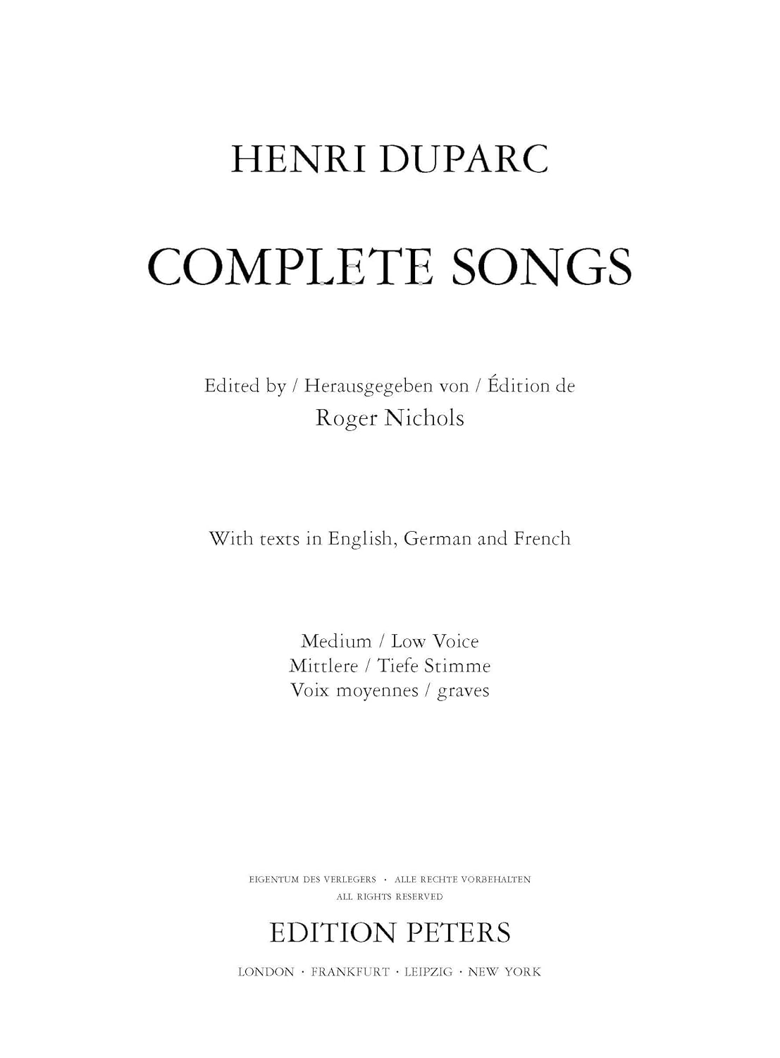 "This new Peters Edition of Duparc songs is most welcome. in beautiful, clear print, it contains not only a great deal of useful information, but also a pronunciation guide for the French and best of all, translations, something the young singer or student will find invaluable. I could not recommend it more highly." -- Dame Janet Baker * Manufacturer EP7778B * Medium-Low Voice * Work French * Urtext / Critical Edition Read more