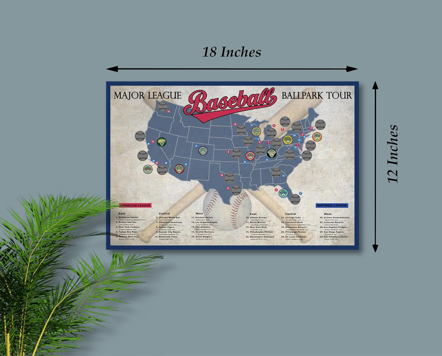 NEW 2025! Includes Athletics' move to Sutter Health Park. Add a touch of sports to your home decor with our Baseball Stadium Scratch Off Map (12"x18"). This unique map features all the Major League Baseball stadiums across North America and allows you to scratch off stadiums you have visited. This Baseball Stadium Travel Poster is an ideal gift for any baseball fan, adding a sense of adventure every time they scratch off another stadium from their list.