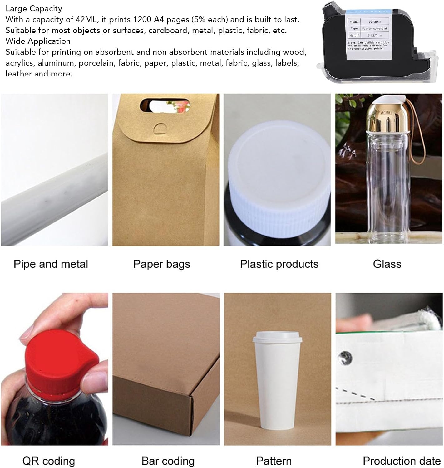 [HIGH SPEED QUICK DRYING INK] Utilizes industrial grade ink, dries quickly preventing smudging. Vibrant colors with uninterrupted printing.[WIDE APPLICATION] Suitable for both absorbent and non-absorbent surfaces. Versatile printing on various materials like wood, plastic, metal, textiles, and more.[LARGE INK CAPACITY] 42ML capacity prints up to 1200 A4 pages. Durable quality for long-lasting usage, minimizing replacements.[VERSATILE 12.7MM INKJET APPLICATION] Designed for various surfaces like cardboard, metals, plastics, and fabrics. Ideal for diverse printing projects.[WIDE COMPATIBILITY] Compatible with printer SC12, SC12T, CP12, CP12W, SC12KJ. Seamless integration for enhanced efficiency.Spec:Item Type: Handheld Inkjet Printer Ink CartridgeSuitable Size: Approx. 12.7mm / 0.5inCapacity: 42MLColor: BlackMaterial: ABSApplicable Machine: Replacement for SC12, Replacement for SC12T, Replacement for CP12, Replacement for CP12W, Replacement for SC12KJApplication: The ink cartridge is suitable for printing on absorbing and non absorbing materials, including wood, acrylic materials, aluminum, ceramics, fabrics, paper, plastics, metals, textiles, glass, labels, leather, etc.Package List:1 x Ink Cartridge1 x AccessoryNote: