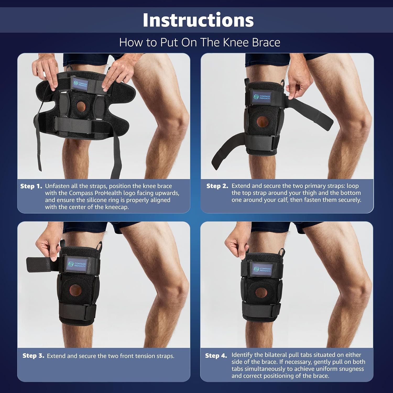 Introducing the Compass ProHealth Hinged Knee Support Brace Your Key to Freedom from Knee Pain In today's fast-paced world, time is our most precious asset. Constantly on the go, the last thing you need is to be held back by knee discomfort. While your knee pain may seem fleeting, its cumulative effect can significantly impede your mobility, robbing you of weeks or even months of movement. Ever wished for a simpler, more efficient way to move? One that not only offers relief for your knee but also saves you valuable time by eliminating the hassle of constantly readjusting a slipping brace? Say Hello to the Compass ProHealth Hinged Knee Support Brace—a game-changer that will revolutionize the way you move. Say goodbye to the limitations imposed by knee pain and hello to uninterrupted movement. Our innovative brace features silicone patella support, keeping your knee securely in place while alleviating pressure. With hinges on both sides, it ensures stability and durability, allowing you to move with confidence and ease. Say farewell to discomfort and hello to freedom with the Compass ProHealth Hinged Knee Support Brace. End the Frustration of Slipping Knee Braces Tired of constantly readjusting your knee brace while on the move? We understand the frustration of having to unwrap and rewrap the whole brace just to pull it up on your thigh. It's a hassle we've all experienced. That's why our innovative pull tabs, located on both sides, allow for instant adjustment of the entire knee brace with just one pull, eliminating wasted time and ensuring uninterrupted movement! Experience the Difference: A Knee Brace Designed by Those Who Understand Our knee brace isn't just a product—it's a solution crafted by a team who knows firsthand the challenges of living with knee pain. Don't let discomfort and restricted movement hold you back from enjoying life to the fullest. Say goodbye to wasted time and hello to the freedom to move with confidence. Invest in the Compas ProHealth Knee Brace and reclaim your time and mobility. Save time and enjoy life with Compass ProHealth Knee Brace. FSA/HSA Eligible Product: Our knee brace is FSA and HSA eligible, enabling you to save money on essential healthcare expenses while receiving the support you need for your knees. Invest wisely in your well-being with our budget-friendly, qualifying product. Step-by-Step Guide for Using Your Compass ProHealth Knee Brace:Begin by positioning the Compass ProHealth Knee Brace directly over your knee. For added comfort, we recommend placing it over clothing to prevent any potential irritation or blistering. Wrap the knee brace around your knee, ensuring a snug fit, and fasten it securely at the back of your knee. Utilize the front straps to adjust the tightness of the brace according to your comfort level and support needs. If you need to readjust the position of the knee brace, simply use the convenient pull tabs located on both sides to effortlessly pull it up or down as needed. With these simple steps, you'll be able to properly fit and adjust your Compass ProHealth Knee Brace for optimal comfort and support, allowing you to move with confidence and ease.