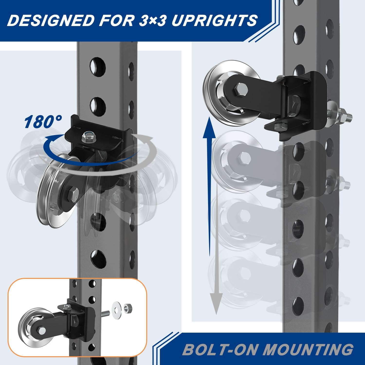 Premium Aluminum Alloy Cable Anchor for Power RacksCrafted from high-strength aluminum alloy, this cable anchor combines durability and corrosion resistance for long-term use in home or commercial gyms. Its smooth machined wheel ensures whisper-quiet cable travel, ideal for pulley workouts, resistance bands, and functional trainer attachments. Designed for 3×3" power racks with 5/8"–1" holes, it may also fit select 2×3 racks—verify your rack’s spacing before purchase. Installation is effortless: no tools are required, just hand-tighten the included bolt for a secure hold (use a wrench for extra tightness if desired). The reinforced structure and rigid mounting design deliver stability and reliability, even under heavy training loads. Elevate your workout setup with this premium, hassle-free solution.