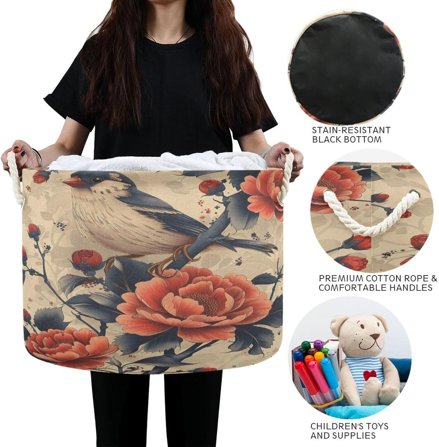 SPECIFICATION Printing: peripheral printing (bottom fixed black, lining fixed white). Material: external canvas, white PE coated fabric for lining, thick cotton rope for carrying handle. Size: 20 inches D, 14 inches H (50.8cm * 35.56cm). Capacity: 72 Liters. Washing: machine washing is not recommended, can be partially hand-washed. FEATURES *Large capacity can hold a week's worth of dirty clothes for a family of four. Makes housework easy. This large cotton storage basket can easily hold toys, clothes, blankets, towels, etc. *No support skeleton used, so it can be folded for storage when not in use. *Waterproof lining can also be used as a laundry basket. *Reinforced cotton rope handle makes transportation easier and more comfortable. *No sharp edges, safer for children to use. APPLICABLE SCENES Bedroom, children's room, closet, bathroom, living room, laundry room and any other place where there is a need to store items. SERVICE We are committed to providing customers with quality products, if our products do not meet your satisfaction, please do not hesitate to contact us directly, we will solve your problems until your satisfaction. Thank you for supporting our products, thank you! :):):)